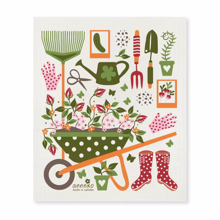 Disktrasan Trädgårdstider, designad av Anneli Asplund, är ett lekfullt och säljande mönster med tydlig koppling till trädgårdsliv. Motivet innehåller detaljer som skottkärra, redskap, blommor och stövlar, vilket gör den extra attraktiv för kunder med intresse för trädgård, odling och natur.